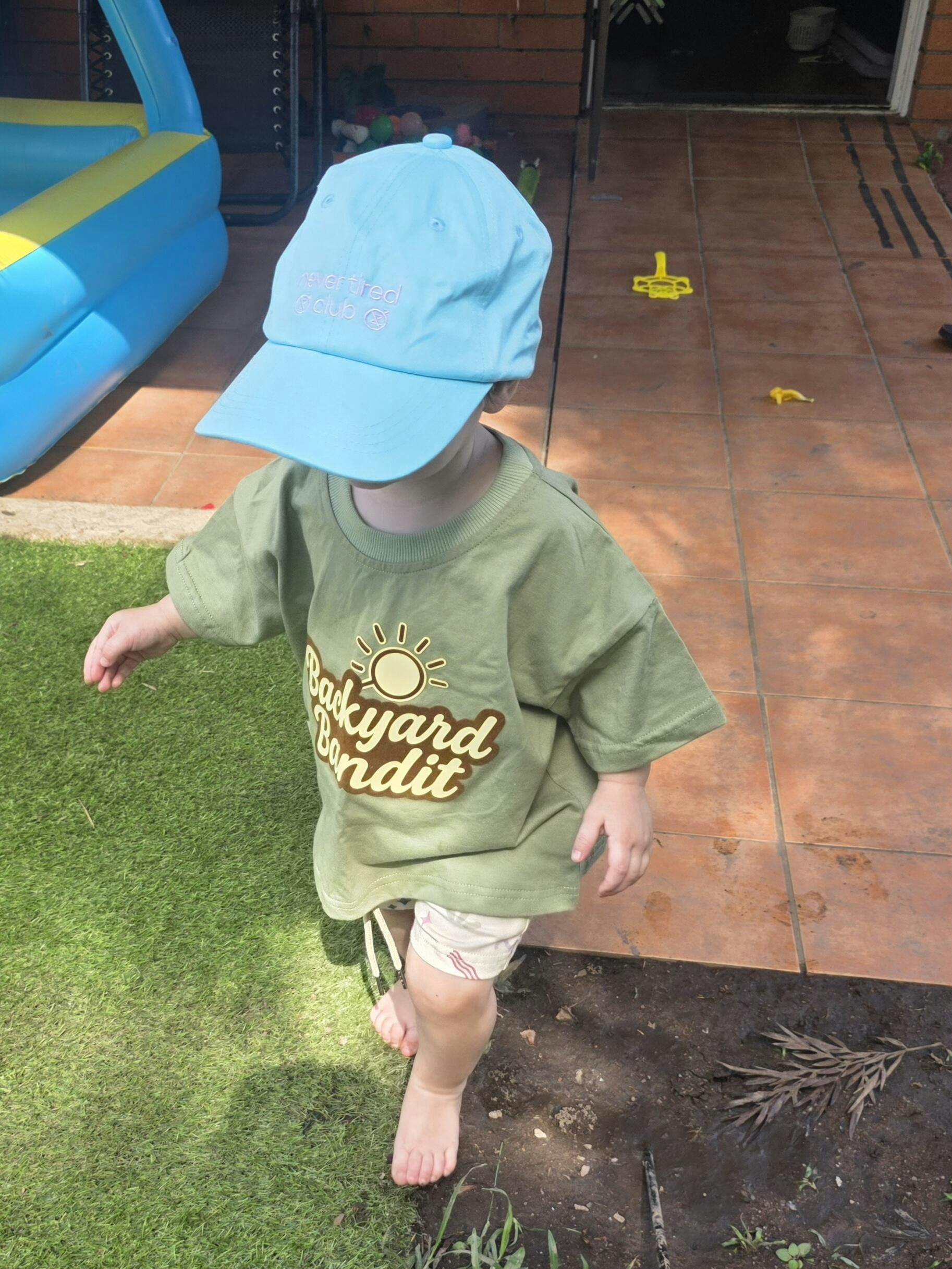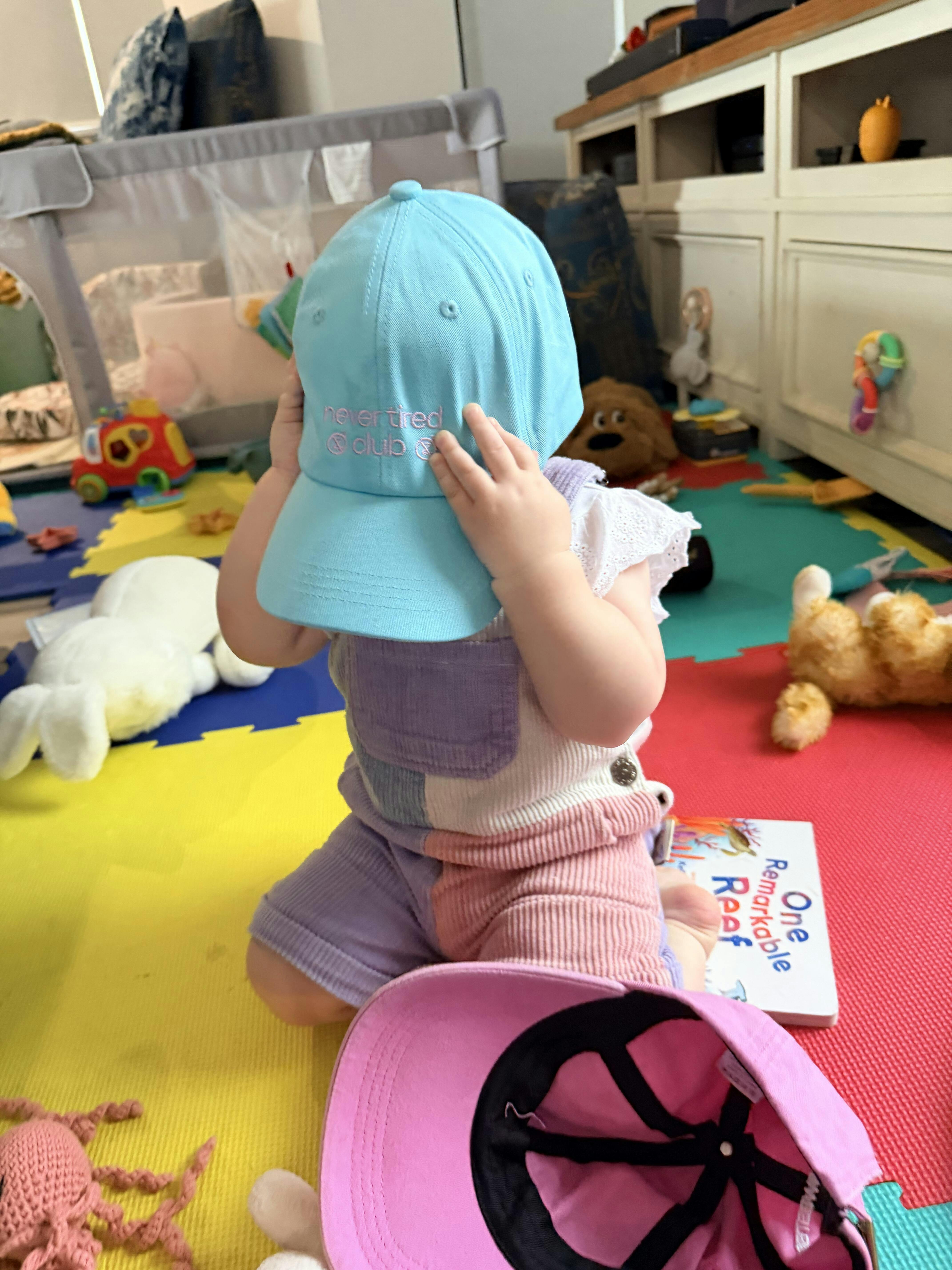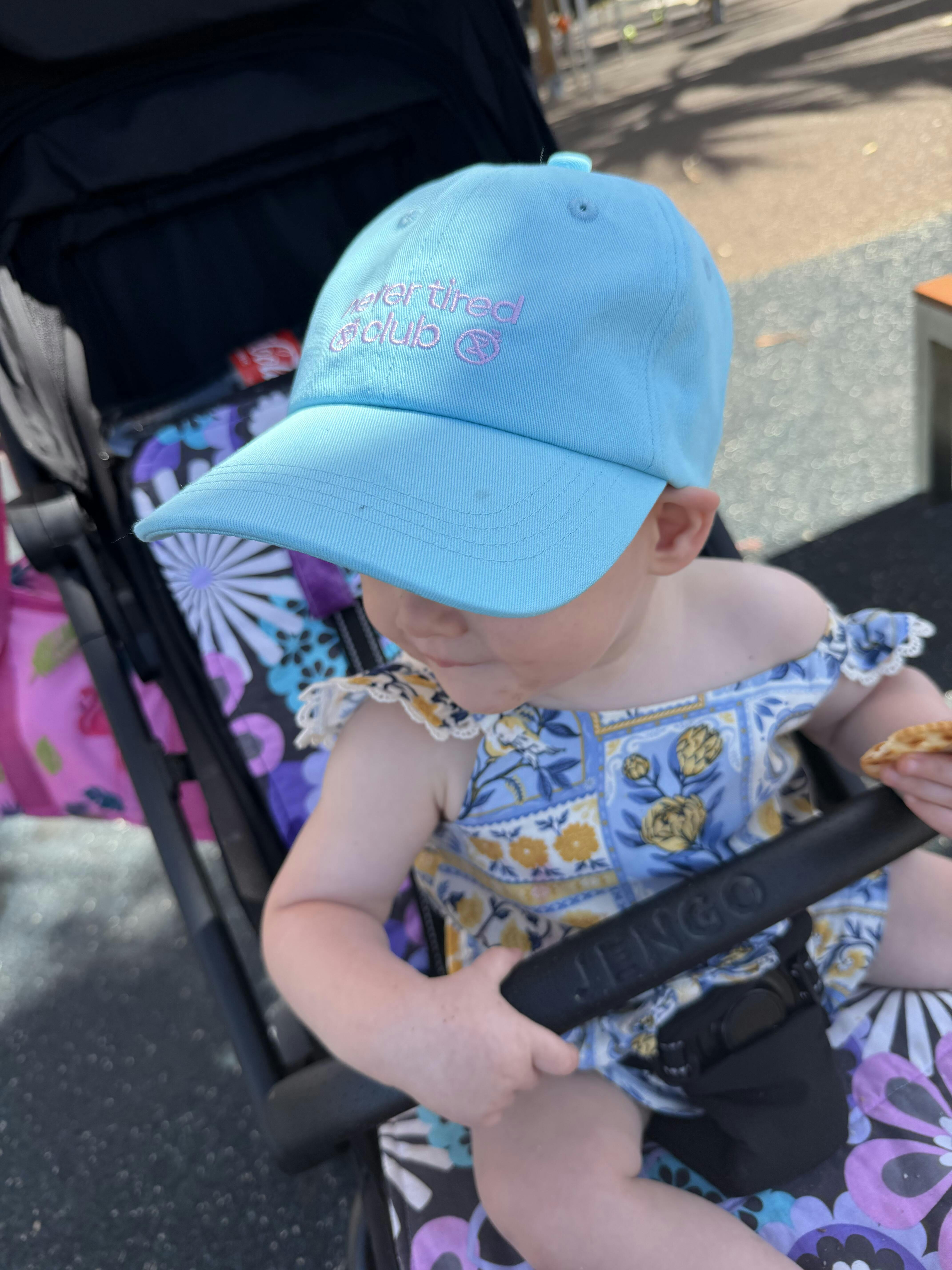 Say hello to the Never Tired Club Cap - a vibrant aqua hat designed for your mini energiser bunny.